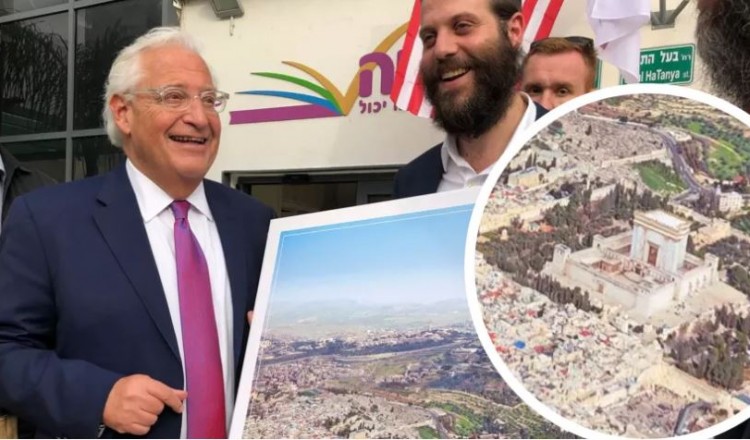 سلّمت جهات صهيونيّة، السفير الأمريكي لددى الاحتلال ديفيد فريدمان، صورةً لمدينة القدس، وقد استبدل المسجد الأقصى بمجسمٍ للهيكل "الصهيوني المزعوم"، ما أثار غضبًا واسعًا في صفوف الفلسطينيين.