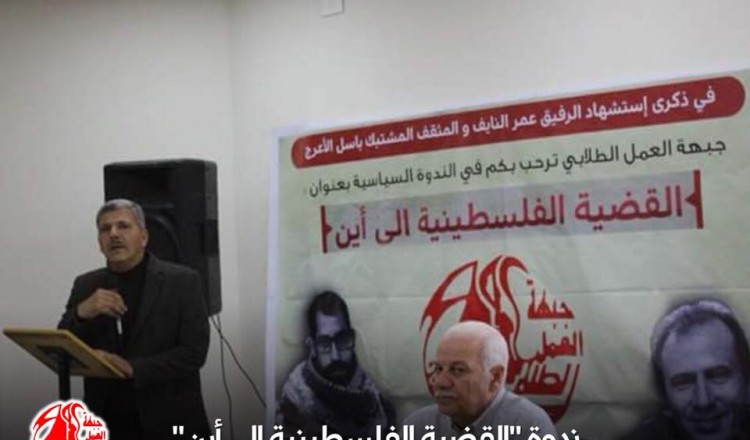 عقدت جبهة العمل الطلابي التقدمية، أمس الثلاثاء، في الحرم الجامعي القديم بجامعة النجاح، ندوة سياسية بعنوان "القضية الفلسطينية: إلى أين؟"، وذلك بمناسبة ذكرى استشهاد الرفيق عمر النايف، والمثقف المشتبك باسل
