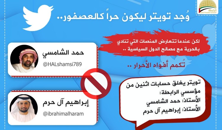أغلق موقع تويتر للتواصل الاجتماعي حسابي أعضاء الرابطة الإماراتية لمقاومة التطبيع، حمد الشامسي، وإبراهيم آل حرم. وقالت الرابطة في تغريدة لها: "وجد تويتر ليكون حرًا، لكن عندما تتعارض المنصات التي تنا