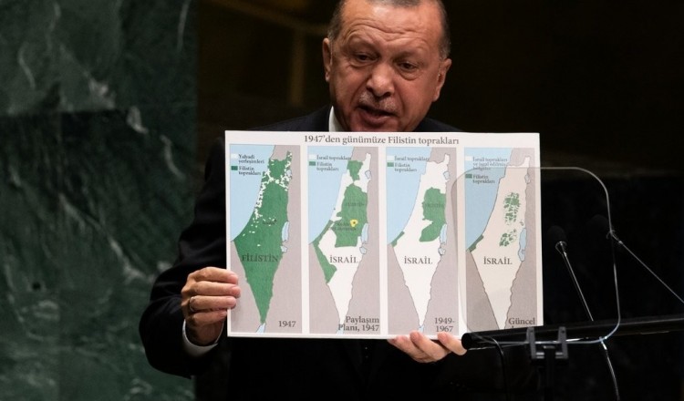 قال الرئيس التركي رجب طيب أردوغان في كلمته أمام الجمعية العامة للأمم المتحدة مساء يوم السبت إن "إسرائيل لم تشبع بعد، وتواصل سلب الأراضي الفلسطينية". وعرض أردوغان خارطة لفلسطين أظهر خلالها كيف أن ال
